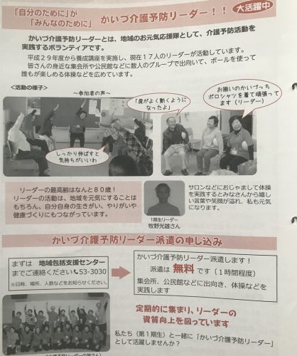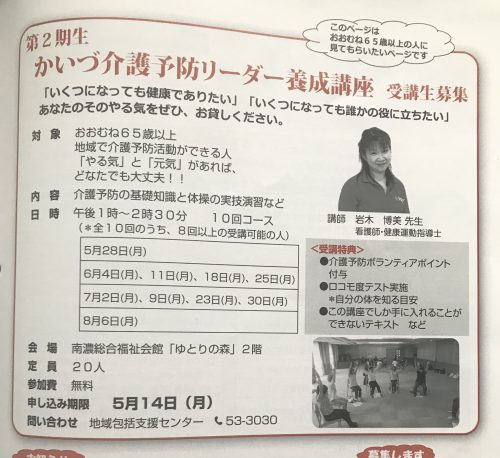 スクールでお世話になっている海津市の介護予防リーダー2期生の募集が今月より始まっています。