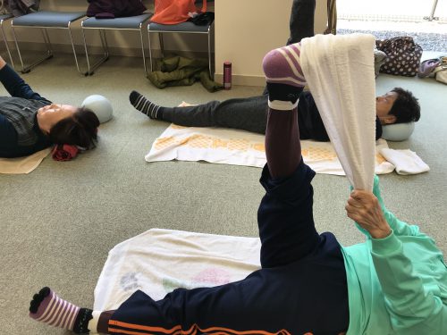 今日は丁寧に腰をほぐし、気の流れを良くする体操も行ってから、筋膜のつながりを意識したエクササイズを行いました。