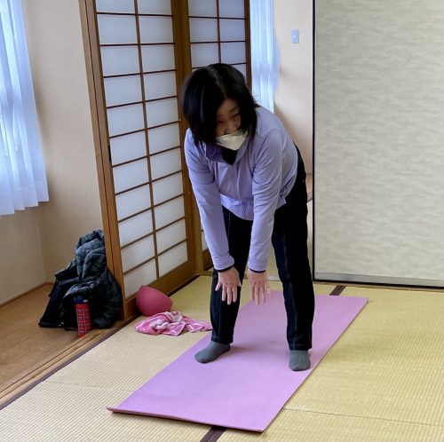 「私ね。ここの教室に初めて来た時、体がとっても固かったの。体調も悪くて悩んでいたら、この教室に通っている〇〇さんに誘ってもらったの。1番最初はこんな感じだったのよ」